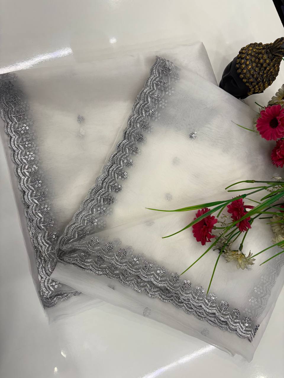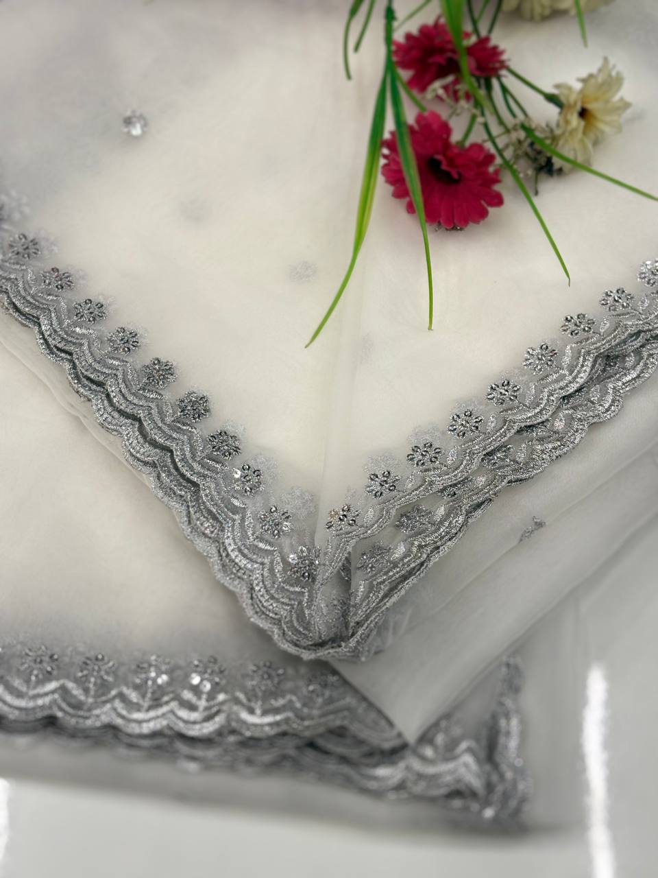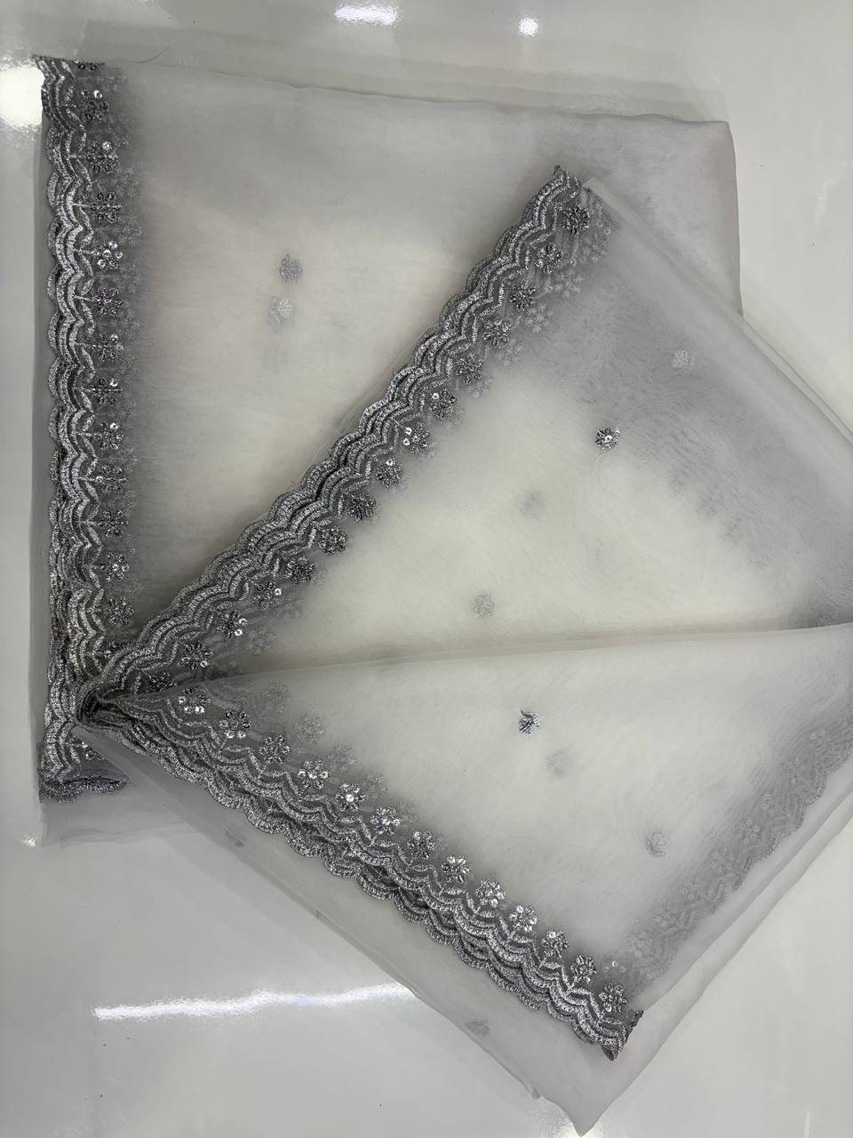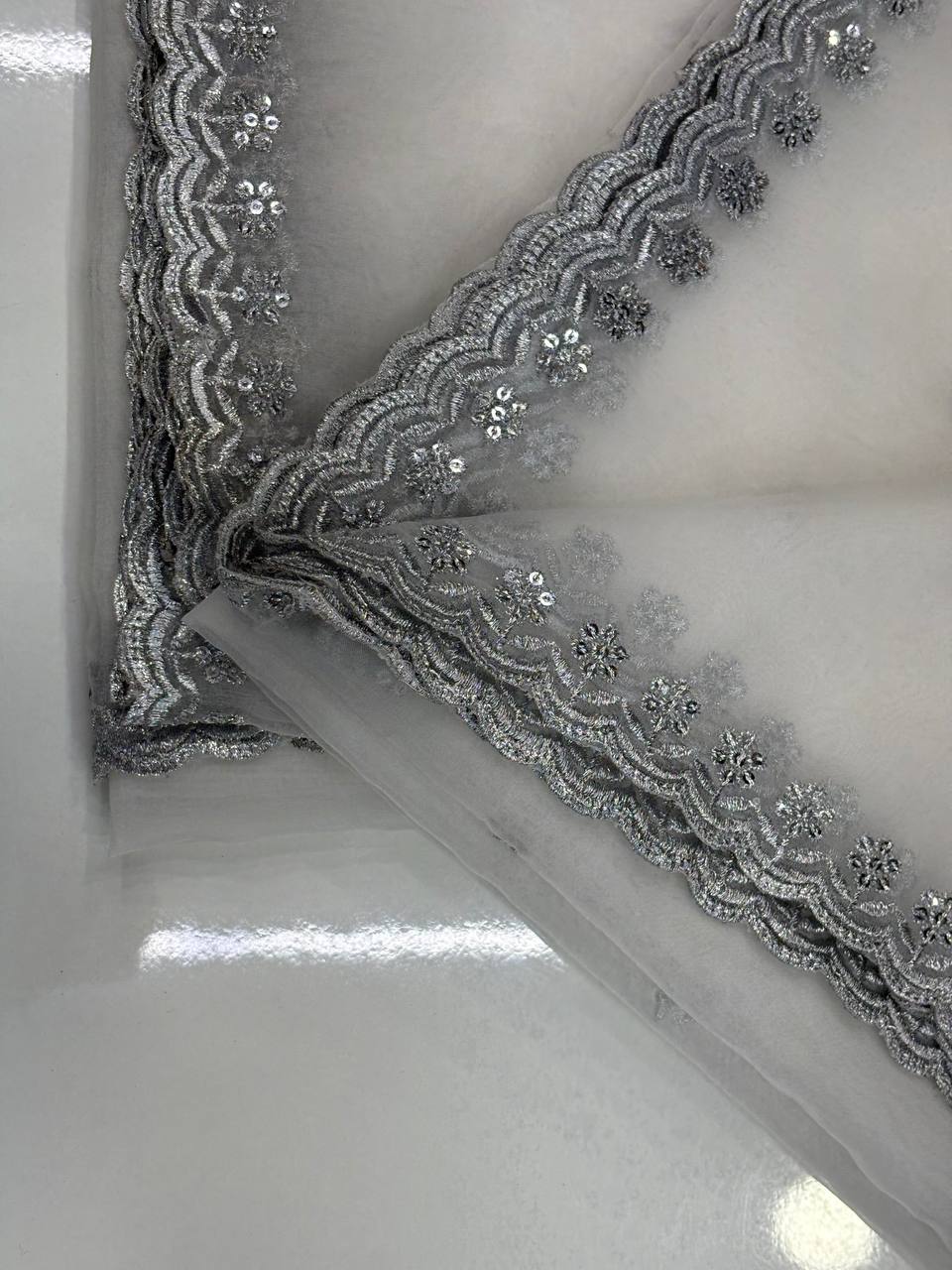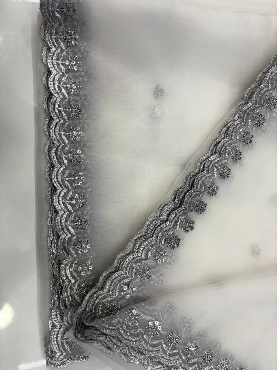 Pure Organza Silver Sequence 4 Side Cutwork Dupatta